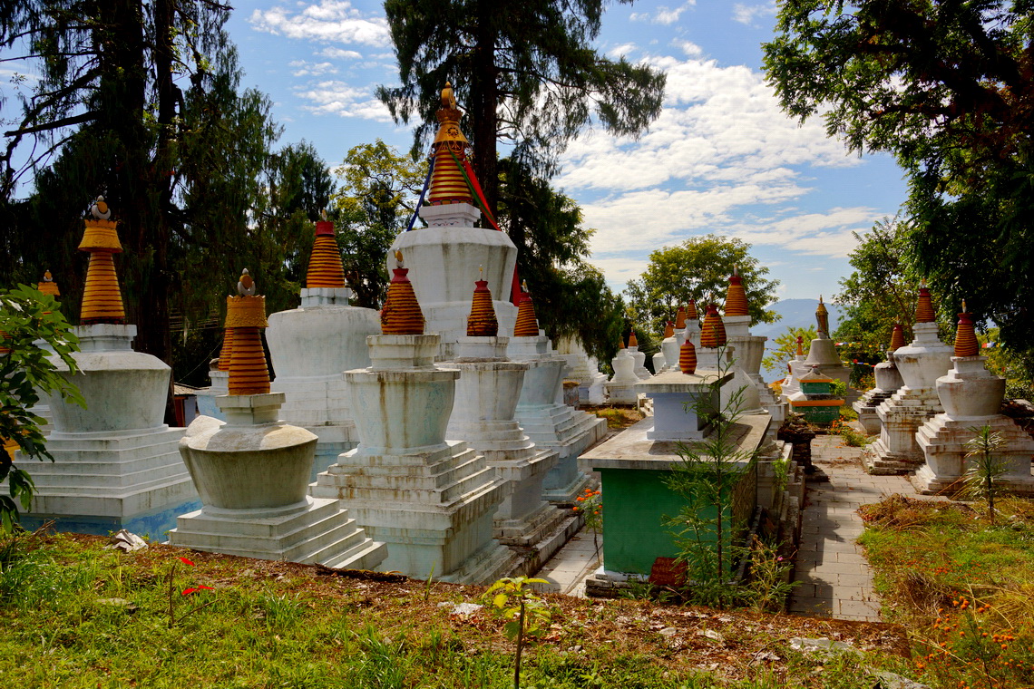 Поле чортенов или ступ знаменито и среди буддистов, и у туристов. Хотя в этот раз мы были одни. Одна из ступ - Тхонгва Рангдол Чортен хранит реликвию Будды, а также, как утверждают монахи, здесь можно найти много следов Гуру Ринпоче. Он посещал это место и находился в пещере, под холмом, где сейчас стоит монастырь. Мы нашли некоторые из них